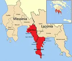 - Mesa Mani (Μέσα Μάνη) or Inner Mani to the southwest, corresponding approximately to southern East Mani