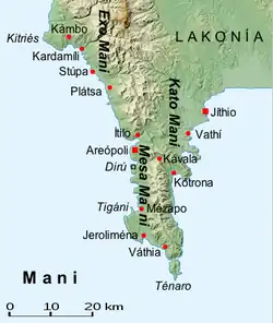 - Exo Mani (Έξω Μάνη) or Outer Mani to the northwest, corresponding approximately to West Mani