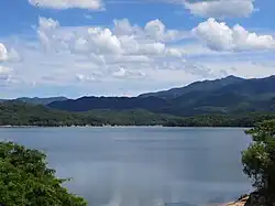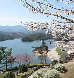 Nestled in the mountains, this lake reservoir is one of the largest in Japan, with a volume of 15,400,000 m3.[4] Kagawa has low rainfall, so rain dances and water reservoirs have been important throughout history, particularly for rice production.[5] The original dam was built about 1,300 years ago, from 701 to 704. In 821 the dam lay in disrepair and a larger version was built by the Buddhist monk Kūkai on the Emperor’s request. Since then the dam has fallen into disrepair and been rebuilt 3 times to reach its current size. The water is used for rice paddy irrigation, and every year in June there is a ceremony to start the yearly flow. Four tonnes of water gush out every second to reach rice paddies as far away as Marugame City. There is also a shrine and a temple near the lakefront.