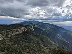 Manzano Peak and the crest and western slopes of the range are included in the Manzano Wilderness which comprises 36,875 acres (14,923 ha) and is 17 miles (27 km) north to south and 3–5 miles (4.8–8.0 km) east-west. There are 64 miles (103 km) of trails in the wilderness, including the 22 mile Crest Trail which traverses the highest part of the range.[3]