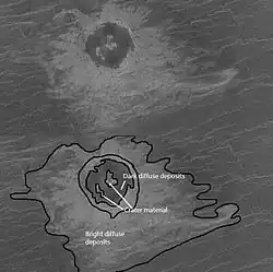 | Dark diffuse deposits | Radar-dark materials | Parabola in shape | |