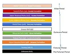 This mapping scheme suggests that there are approximately 12 global stratigraphic units on Venus which are present on different quadrangles.[13] These stratigraphic units and landforms are listed below in terms of mechanism from the oldest to the youngest.