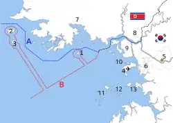 B: "Inter-Korean MDL in the Yellow Sea", declared by North Korea in 1999[20] The locations of specific islands are reflected in the configuration of each maritime boundary, including: