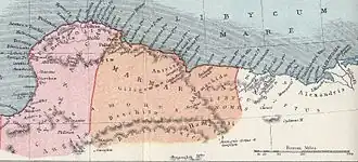 Marmarica (Ancient Greek: Μαρμαρική, Arabic: مراقيه, romanized: Maraqiyah[1]) in ancient geography was a littoral area in Ancient Libya, located between Cyrenaica and Aegyptus.[2] It corresponds to what is now the Libya and Egypt frontier, including the towns of Bomba (ancient Phthia), Timimi (ancient Paliurus), Tobruk (ancient Antipyrgus), Acroma (ancient Gonia), Bardiya, As-Salum, and Sidi Barrani (ancient Zygra). The territory stretched to the far south, encompassing the Siwa Oasis, which at the time was known for its sanctuary to the deity Amun. The eastern part of Marmarica, by some geographers considered a separate district between Marmarica and Aegyptus, was known as Libycus Nomus. In late antiquity, Marmarica was also known as Libya Inferior, while Cyrenaica was known as Libya Superior.
