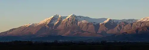 The Marsican region extends for about 1906 km2 on a heterogeneous territory; the flat areas are the Fucino basin (140 km2), the Palentini plains (60 km2) and the more contained Cavaliere plain. Mount Velino is its highest peak (2487 m) while the lower area is located in the comune of Balsorano (293 m). The greatest differences in height are recorded in Magliano dei Marsi and in Celano; on the contrary the comune of San Benedetto dei Marsi, overlooking the lake, has an excursion of 50 meters.[3] The highest municipalities are Ovindoli and Opi, respectively located at an altitude of 1 375 and 1 250 meters above sea level.[4][5]