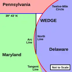 - Should any land within the 12-mile circle fall west of the north line, it would remain part of Delaware. (This was indeed the case, and this border is the "arc line".)