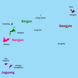 The Matsu Islands comprise 19 islands and islets,[53] which include five major islands, which are Nangan, Dongju and Xiju (both in Juguang Township), Beigan and Dongyin.[19] Minor islands include Liang Island, Gaodeng Island, Daqiu Island and Xiaoqiu, which are part of Beigan Township.[54] The shortest distance between Huangqi, Lianjiang County and the Matsu Islands is also the shortest distance between China (PRC) administered territory and territory in the ROC (Taiwan)-administered Matsu Islands.[55][56]