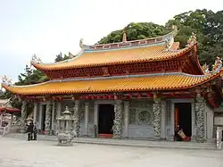 The Matsu Islands[17][18][19][20] are named after the main island, Nangan (Nankan). Nangan is also named Matsu Island[8] because of a temple on the island which is supposed to be the burial site of the similarly named goddess Mazu (媽祖).[21] Matsu is the Wade-Giles-derived romanization of the Mandarin pronunciation (Ma³-tsu³) for the Chinese character name (馬祖) of the islands. The Matsu Islands are also known by other Chinese-language names including Chinese: 馬祖群島; pinyin: Mǎzǔ Qúndǎo and 馬祖島; Foochow Romanized: Mā-cū dō̤).