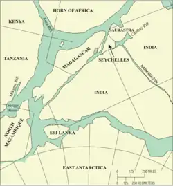 Mauritia was a Precambrian microcontinent that was situated between India and Madagascar until their separation about 70 million years ago. Being initially attached to the Indian continent, Mauritia separated from it about 60 million years ago and further fragmented into a ribbon-like structure as the mid-ocean ridge jumped several times. The jumps of the mid-ocean ridge are thought to have been caused of its interaction with the Réunion hotspot as it passed under the West margin of the Indian continent and then under Mauritia.[1][2][3] As of today, the fragments of Mauritia include the Laccadives–Maldives–Chagos Ridge, Nazareth Bank, the Saya de Malha Bank, and Hawkins Bank, as well as the islands of Réunion and Mauritius, where the continual crust is buried under basaltic lavas of the Réunion hotspot.[1]