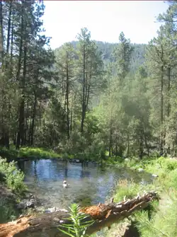 McCauley Hot Springs is a large, shallow warm spring with a primitive rock-lined, gravel-bottomed soaking pool in the Santa Fe National Forest. The spring water cascades into a number of smaller and deeper soaking pools in a clearing in the forest.[2] The rock dam pool was constructed by the Civilian Conservation Corps.[3] The spring pools are surrounded by ponderosa pines.[4]