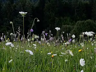 A similar concept to the hay meadow is the pasture, which differs from the meadow in that it is grazed through the summer rather than being allowed to grow out and periodically be cut for hay.[3] A pasture can also refer to any land used for grazing, and in this wider sense the term refers not only to grass pasture but also to non-grassland habitats such as heathland, moorland and wood pasture.[6] The term grassland is used to describe both hay meadows and grass pastures.[7]