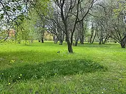 A transitional meadow occurs when a field, pasture, farmland, or other cleared land is no longer cut or grazed and starts to display luxuriant growth, extending to the flowering and self-seeding of its grass and wildflower species.[8] The condition is however only temporary, because the grasses eventually become shaded out when scrub and woody plants become well-established, being the forerunners of the return to a fully wooded state.[9] A transitional state can be artificially-maintained through a double-field system, in which cultivated soil and meadows are alternated for a period of 10 to 12 years each.[8]