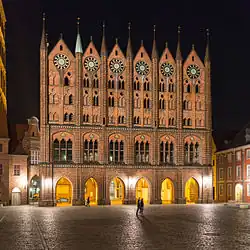 The cities are characterised by a certain "Hanseatic" style also found in other parts of northern Germany (e.g. Lübeck) as well as in countries bordering the Baltic Sea like Estonia (e.g. Tallinn) or Latvia (e.g. Riga). A common feature of many towns in Mecklenburg and Vorpommern are red Brick Gothic churches and houses dating back to the Middle Ages. Also stepped and tailed gables are a typical feature of the Hanseatic old towns, such as Stralsund, Wismar and Greifswald.