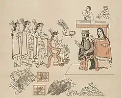 The city of Mexico-Tenochtitlan was founded by the Mexica people in 1325 or 1327.[47] The old Mexica city that is now referred to as Tenochtitlan was built on an island in the center of the inland lake system of the Valley of Mexico, which is shared with a smaller city-state called Tlatelolco.[48] According to legend, the Mexicas' principal god, Huitzilopochtli, indicated the site where they were to build their home by presenting a golden eagle perched on a prickly pear devouring a rattlesnake.[49]