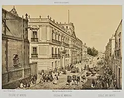 Preconquest Tenochtitlan was built in the center of the inland lake system, with the city reachable by canoe and by wide causeways to the mainland. The causeways were rebuilt under Spanish rule with indigenous labor. Colonial Spanish cities were constructed on a grid pattern, if no geographical obstacle prevented it. In Mexico City, the Zócalo (main square) was the central place from which the grid was then built outward. The Spanish lived in the area closest to the main square in what was known as the traza, in orderly, well laid-out streets. Indigenous residences were outside that exclusive zone and houses were haphazardly located.[59] The Zócalo was a center of commerce for indigenous people, making Spanish efforts to keep the area segregated difficult to enforce.[60] At intervals Zócalo was where major celebrations took place as well as executions. It was also the site of two major riots in the seventeenth century, one in 1624, the other in 1692.[61]