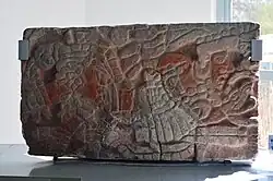 The modern archaeological site consists of the ceremonial center of Tula Grande, an area called Tula Chico, the Jorge R. Acosta site museum, and the Guadalupe Mastache orientation center.[33] The ceremonial center of the city is located on a limestone outcropping, with steep banks on three sides, making it defensible.[34] War and sacrifice are prominent themes at the site, with images representing warriors such as jaguars and coyotes, as well as eagles eating human hearts. There are also images of serpents eating skeletal figures and skulls in various areas.[32][34] The major attraction of the site is Pyramid B, also called the Pyramid of Quetzalcoatl or of the Morning Star. It is a five-tiered structure similar to the Temple of the Warriors at Chichen Itza. At the top of Pyramid B are four massive columns, each carved in the likeness of Toltec warriors which once supported the roof of the temple on top of the pyramid. Each warrior figure is of basalt, 4 metres (13 ft) high, with an atlatl or spear thrower, incense, a butterfly-shaped chest plate, and a back plate in the shape of a solar disk.[34]