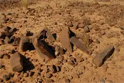 The Malian Lakes Region may have served as the second regional center of the Tichitt Tradition.[7] In the Malian Lakes Region, there is a drystone enclosure that is greater than 4 meters in height and several hundred meters in circumference, two cemeteries, and within the enclosure, a possible cistern building with remnants of a room that is between 6 meters and 7 meters in diameter; there are also other drystone structures of different sizes and kinds, which include a large rectangular enclosure, enclosures with small-sized circular structures, a carved stone as part of a broader system of structures, stone walls, as well as cemeteries with stones positioned in the head and foot areas of the graves.[7] Additionally, there are stones that are 2 meters in diameter are set within circular patterns are found among a few stone structures, grindstone and millstone remnants, and pottery with decorative patterns.[7] Within the region, nearby Tondidarou, a stone wall may have served as a regional boundary, stone tumuli and circles that may be cemeteries, and a couple of drystone fortification remnants; there are also pottery and stone tools at Mobangou, as well as mounds and stone structures nearby Mobangou.[7] On the eastern side of Lake Fati, there are large enclosures on the massifs containing dozens of conjoined circular drystone structures, and on the eastern side of Lake Faguibine, there are similar enclosures and structures spanning 74 kilometers north from its eastern shoreside; there are also stone walls ranging about one meter in height.[7]