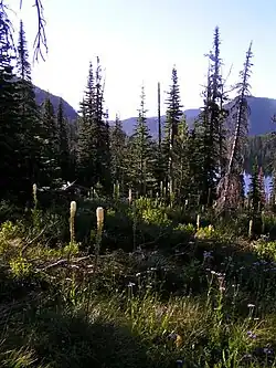 The most common trees found in the range are the ponderosa pine, western red cedar, douglas fir, western larch, western white pine, lodgepole pine, limber pine, whitebark pine, Engelmann spruce, alpine fir, grand fir, western larch, quaking aspen, alder, and Rocky Mountain maple. Cedars most often grow in the creek bottoms while others are spread throughout the landscape.[5]