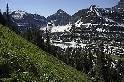 In the 1930s, the Mission Mountains were considered for inclusion in a proposed national park in the area south of Glacier National Park. Ronan Commercial Club president J. L. Jones wrote to the National Park Service director in support of the idea, "We suggest, Mr. Albright, that you add to your already splendid services the inclusion of the Mission Range of mountains... Truly we possess here not the 'garden of Eden,' but that being lost only in myth and tradition we have a most fitting substitute 'The Garden of the Rockies.'"[6] The park service sent a team to study the region during the summer of 1937, but in the end they rejected the proposal, writing, "the Flathead would be of special value in the National Park system if this section were not already fairly well represented by Glacier Park."[7]