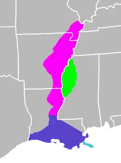 The plain is divided into (a) the Mississippi River Delta in the southern half of Louisiana and (b) the upper Mississippi Embayment running from central Louisiana to Illinois.[2]