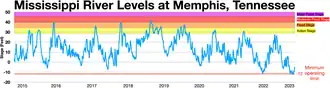 In late 2022 there was low river levels that caused two backups on the Lower Mississippi River that held up over 100 tow boats with 2,000 barge units and caused barge rates to soar[23][24]