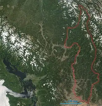 ![]() Monashee Mountains are indicated. In the left of the image lies Vancouver Island. The boundary here includes the Okanagan Highland and portions of the Shuswap Highland. | |