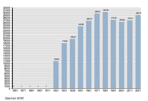 As of December 31, 2024, foreigners residents in the municipality were 9,991, i.e. 32.0% of the population.[7] The largest foreign community is that from Bangladesh with 55.0% of all foreigners present in the city, followed by Romania and North Macedonia.[8]