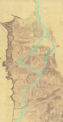 During the Mexican Rancho era, a road known as Camino Pedro Cuesta also traversed Saddle Pass and connected the Sanchez Adobe in Rancho San Pedro in San Pedro Valley with Rancho Corral de Tierra Palomares in Montara. Following the Mexican–American War of 1848, this routing was known as "Road Trail" and was considered to be nearly impassable to wheeled vehicles. In 1879 this steep and rutted Road Trail crossing of Montara Mountain was replaced by the marginally improved road known as the Half Moon Bay - Colma Road, which included road grades of 24%. This road which routed closer to the ocean and Devil's Slide terminated in Shamrock Ranch and persisted until 1915.[6]