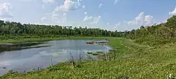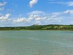 Before the most recent continental glaciation[2] 23,000 years ago,[3] Moose Mountain was capped by Tertiary-age gravels. As the ice began to retreat about 17,000 years ago from southern Saskatchewan, the highest hills formed nunataks in the ice sheet.[3] The protrusion of the Moose Mountain Upland initiated an interlobate area between two glacial lobes, the Weyburn Lobe and the Moose Mountain Lobe. On the southern side of the upland, in the interlobate area, a short lived glacial lake named Lake Arcola formed. The Moose Mountain Creek Spillway drained the area southward into the Souris Spillway.[4] As the ice was melting away, large chunks were left behind forming depressions called kettles or potholes (locally, the depressions are called 'sloughs') in the ground. The retreating ice also left small shallow lakes, knobs, and moraines dotted all over Moose Mountain and the surrounding prairies. This region of North America is referred to as the Prairie Pothole Region.