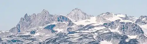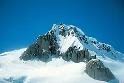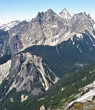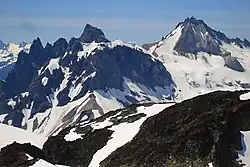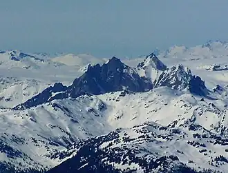 Three main summits comprise the Mount Cayley massif.[6] The highest and northernmost is Mount Cayley with an elevation of 2,385 m (7,825 ft).[1] Its northeastern flank abuts the southern end of the Powder Mountain Icefield.[6][1] This is a 9 km (5.6 mi) long and 5 km (3.1 mi) wide irregularly-shaped glacier that trends slightly to the northwest.[1] Just southwest of Mount Cayley lies Pyroclastic Peak, 2,341 m (7,680 ft) in elevation. It contains a jagged summit ridge of many slender rock pinnacles, the largest of which is known as the Vulcan's Thumb.[4] Wizard Peak with an elevation of 2,240 m (7,350 ft) is east of Pyroclastic Peak and is the lowest of the three main summits.[1]