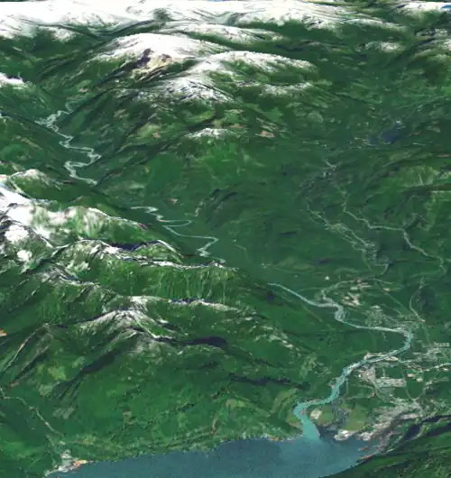 Mount Cayley is an eroded but potentially active stratovolcano in the Pacific Ranges of southwestern British Columbia, Canada. Located 45 km (28 mi) north of Squamish and 24 km (15 mi) west of Whistler, the volcano resides on the edge of the Powder Mountain Icefield. It consists of massif that towers over the Cheakamus and Squamish river valleys. All major summits have elevations greater than 2,000 m (6,600 ft), Mount Cayley being the highest at 2,385 m (7,825 ft). The surrounding area has been inhabited by indigenous peoples for more than 7,000 years while geothermal exploration has taken place there for the last four decades.