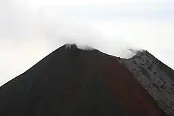 Eruptions from Mount Cleveland are generally vulcanian and strombolian in nature, characterized by short explosive ash clouds sometimes accompanied by a'a flows,[9] lava fountains,[13] pyroclastic flows,[14] ash and steam emissions, lava dome growth,[4] and the ejection of breadcrust bombs.[14] Hot springs were reportedly found on the volcano in the 1800s,[1] and persistent fumarolic activity was observed in the 1980s and 1990s.[4] Mount Cleveland is a site of persistent steam emissions and thermal anomalies that represent constant background activity.[9] During 2011, a summit lava dome formed, by continuous intrusion of magma at the summit. Late in 2011, nearly 6 explosions demolished the dome. In June 2012, another small dome was observed.