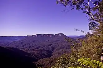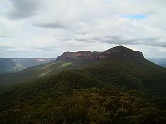 Mount Solitary is located in the middle of the Jamison Valley, one of the main valleys of the Blue Mountains region, immediately south of Katoomba.[1] It is a long, low mountain of sandstone, stretching across the valley from west to east. Its top is approximately 5 kilometres (3.1 mi) long; counting its lower slopes, it would be approximately 10 kilometres (6.2 mi) long. It is approximately 950 metres (3,120 ft) above sea level at its highest point.[2] It is nearly covered in eucalyptus forest, with a small group of pine trees at the western end. Small and rugged pockets of semi-rainforest are found along its slopes, particularly where water gathers in gullies. Snow is known to fall occasionally on the high points during winter.