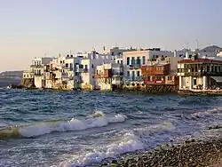 - Little Venice – rows of fishing houses line the waterfront with their balconies hanging over the sea. The first of these was constructed in the mid-18th century. They originally belonged to rich merchants or captains and the little basement doors that provided direct access to the sea and underground storage areas led people to believe that the owners were secretly pirates. Some of the houses have now been converted into bars and cafes and little shops and galleries. Little Venice is considered one of the most romantic spots on the island and many people gather there to watch the sunset. The area attracts many artists who come to paint the picturesque coastline.[32]