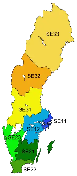 The 8 riksområden (Singular : Riksområde) includes the 21 counties of Sweden.[2] Only Stockholm (SE01) corresponds simply to the homonymous county.