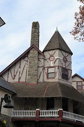 The campus began in 1887 as "Ye Forest Inne," a summer vacation retreat for Washington, D.C., residents. The retreat did not succeed financially, and the property was sold and redeveloped as a finishing school, opening in 1894 with a class of 48 female students.[2] The architecture of the campus remained eclectic and whimsical. In addition to various Victorian styles, exotic designs included a Dutch windmill, a Swiss chalet, a Japanese pagoda, an Italian villa, and an English castle.[3] Many of these small homes with international designs were built from blueprints obtained by competing sororities, but all were designed by architect Emily Elizabeth Holman of Philadelphia, Pennsylvania.[4] The campus also featured covered walkways, outdoor sculptures, and elaborately planned formal gardens. Among the administration was Assistant Dean of the college, Miss Edna Roeckel.[5] In 1936 it was renamed "National Park College" and its focus was realigned with more modern education trends; it remained one of the most prestigious women's schools in the country.[6]