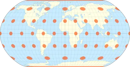 In the original definition of the projection, planar coordinates were lineally interpolated from a table of 19 latitudes and then multiplied by other factors. The authors of the projection later provided a polynomial representation that closely matches the original but improves smoothness at the "corners".[2][3]