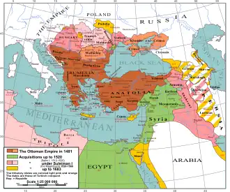 The Near East (Arabic: الشرق الأدنى) is a transcontinental region around the Eastern Mediterranean encompassing the historical Fertile Crescent, the Levant, Anatolia, Egypt, the Balkans, Mesopotamia, and coastal areas of the Arabian Peninsula.[1] The term was invented in the 20th century by modern Western geographers and was originally applied to the Ottoman Empire,[2] but today has varying definitions within different academic circles. The term Near East was used in conjunction with the Middle East and the Far East (China and beyond), together known as the "three Easts"; it was a separate term from the Middle East during earlier times and official British usage. As of 2024, both terms are used interchangeably by politicians and news reporters to refer to the same region.[3] Near East and Middle East are both Eurocentric terms.[4]