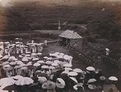 The new Hong Kong governor, Henry Blake, arrived in November 1898. The date for the takeover of the New Territories was fixed as 17 April 1899, and Tai Po was chosen as the administrative centre. The transfer was not smooth and peaceful. In early April 1899, the captain superintendent of police, Francis Henry May, and some policemen erected a flagstaff and temporary headquarters at Tai Po and posted the governor's proclamation of the takeover date. Fearing for their traditional land rights, in the Six-Day War of 1899, a number of clans attempted to resist the British, mobilising clan militias[8] that had been organised and armed to protect against longshore raids by pirates. The militia men attempted a frontal attack against the temporary police station in Tai Po that was the main British base but were beaten back by superior force of arms. An attempt by the clansmen at guerilla warfare was put down by the British near Lam Tsuen with over 500 Chinese men killed, and collapsed when British artillery was brought to bear on the walled villages of the clansmen. Most prominent of the villages in the resistance Kat Hing Wai, of the Tang clan, was symbolically disarmed, by having its main gates dismounted and removed. However, in order to prevent future resistance the British made concessions to the indigenous inhabitants with regards to land use, land inheritance and marriage laws; the majority of which remained in place into the 1960s when polygamy was outlawed. Some of the concessions with regard to land use and inheritance remain in place in Hong Kong to this day and is a source of friction between indigenous inhabitants and other Hong Kong residents.