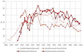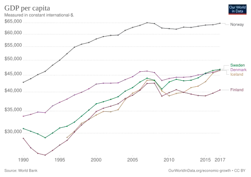 The Nordic countries cluster near the top in numerous metrics of national performance, including education, economic competitiveness, civil liberties, quality of life and human development.[5] Each country has its own economic and social model, sometimes with large differences from its neighbours. Still, they share aspects of the Nordic model of economy and social structure to varying degrees.[6] This includes a mixed market economy combined with strong labour unions and a universalist welfare sector financed by high taxes, enhancing individual autonomy and promoting social mobility. There is a high degree of income redistribution, commitment to private ownership and little social unrest.[7][8]