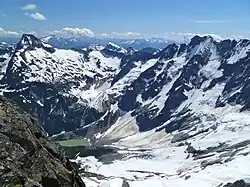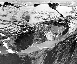 While alpine glaciers are a defining feature of the Cascade Range as a whole, this is especially true of the North Cascades. The stratovolcanoes (Mount Baker and Glacier Peak) are the most obviously glaciated peaks and have the largest glaciers, but many of the smaller, nonvolcanic peaks are glaciated as well. For example, the portion of the Cascades north of Snoqualmie Pass (roughly the North Cascades as defined in this article) These glaciers all retreated from 1900 to 1950. From 1950 to 1975 many but not all North Cascades glaciers advanced. Since 1975 retreat has become more rapid with all 107 glaciers monitored retreating by 1992. 2015 was an especially damaging year for Cascadian Glaciers, an estimated mass loss of five to ten percent, the single greatest loss in over 50 years.[18] There are approximately 700 glaciers in the range, though some have already disappeared.[19] Since a brief advancing period in the 1950s, most of these glaciers have been retreating. This is a serious concern to water managers in the region, as the glaciers (and the winter snowpack) form a large reservoir of water. As snow and ice melts in the summer, the resulting meltwater compensates for the seasonal decrease in precipitation. As glaciers retreat they will provide less summer runoff.