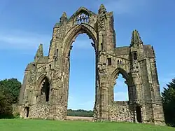 The area has a strong religious past, as can be seen in works such as the Lindisfarne Gospels and the Anglo-Saxon Chronicle.[9] The works of Cuthbert (634–687 AD), Bede (673–735 AD) and Hilda of Whitby (614–680 AD) were hugely influential in the early church, and are still venerated by some today.[10][11] These saints are usually associated with the monasteries on the island of Lindisfarne, Wearmouth-Jarrow, and the Abbey at Whitby, though they are also associated with many other religious sites in the region. Bede is regarded as the greatest Anglo-Saxon scholar. He worked at the monasteries of Wearmouth and Jarrow, translating some forty books on all areas of knowledge, including nature, history, astronomy, poetry and theological matters such as the lives of the saints. His best known work is "The Ecclesiastical History of the English People".[12] One of the most famous pieces of art and literature created in the region is the Lindisfarne Gospels, thought to be the work of a monk named Eadfrith, who became Bishop of Lindisfarne in 698. This body of work is thought to have been created in honour of Cuthbert, around 710–720.[13]