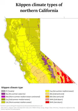 Northern California has a warm or mild to cool climate, in which the Sierra mountains gets snow in the late fall through winter and occasionally into spring. Summers are mild along the coast and generally warm and dry, while winters are cool and usually wet. The high temperatures range from 50s °F (10–15 °C) to 30s °F (−1 – +4 °C) in the winters while summers temperature range is 90s °F (32–37 °C) to 60s °F (15–20 °C) or 50s °F (10–15 °C), with highs well into the 100s °F (37–42 °C) for the Sacramento region. Snow covers the mountains (generally above 3,000 feet (910 m)) in mid January through February. Fog occurs infrequently or occurs normally in the west and coast, especially in the summer, creating some of the coolest summer conditions in North America.[28] Since the first decade of the 21st century, droughts and wildfires have increased in frequency as a consequence of climate change.[29][30]