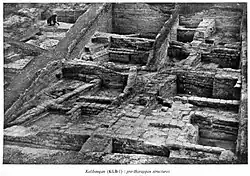 By 55,000 years ago, the first modern humans, or Homo sapiens, had arrived on the Indian subcontinent from Africa, where they had earlier evolved.[29][30][31] The earliest known modern human remains in South Asia date to about 30,000 years ago.[29] After 6500 BC, evidence for domestication of food crops and animals, construction of permanent structures, and storage of agricultural surplus appeared in Mehrgarh and other sites in Balochistan, Pakistan.[32] These gradually developed into the Indus Valley Civilisation,[33][32] the first urban culture in South Asia,[34] which flourished during 2500–1900 BC north-western Indian subcontinent.[35] Among its urban centres, Kalibangan (in Rajasthan) and Rakhigarhi (in Haryana) were prominent.[34] These cities participated in a complex system of urban planning, long-distance trade, and craft production, sustained through a variety of subsistence strategies.
