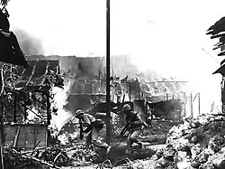 On June 15, 1944, the United States military invaded the Mariana Islands, starting the Battle of Saipan, which ended on July 9. Of the 30,000 Japanese troops defending Saipan, fewer than 1,000 remained alive at the battle's end.[28] Many civilians were also killed, by disease, starvation, enemy fire, or suicide; about 1,000 civilians killed themselves by jumping off cliffs.[29] U.S. forces then recaptured Guam on July 21, and invaded Tinian on July 24. A year later, Tinian was the takeoff point for the Enola Gay, the plane that dropped the atomic bomb on Hiroshima. Rota was left untouched (and isolated) until the Japanese surrender in August 1945, owing to its military insignificance and U.S. forces' strategy of "island hopping" in which they did not invade islands that they did not need. The story of the holdouts on Anatahan was told in 1953 by Josef von Sternberg in his film The Saga of Anatahan.