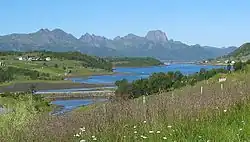 Lofoten is a chain of peaks that jut out of the ocean. From the mainland side it looks very barren, but behind the violet-black peaks there are also flatlands with good grazing for sheep, partially on soil made from seaweed. The Vesterålen islands consist of smaller and bigger islands with a huge variation in landscape. Ofoten, further inland, is a fjord landscape with high mountains, the highest is Storsteinfjellet in Narvik, 1,894 m above sea level, but the most well-known is Stetind, the national mountain of Norway. There are also glaciers, like Frostisen and Blåisen.
