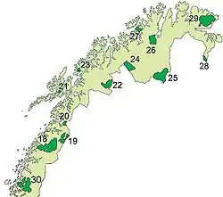 National parks in Northern Norway. Lomsdal-Visten National Park was established May 2009 (no 30). Børgefjell National Park is also partially located in Trøndelag county and does not show up on map.
