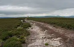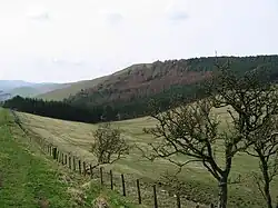 The Cheviot Hills, in the northwest of the county, consist mainly of resistant Devonian granite and andesite lava. A second area of igneous rock underlies the Whin Sill (on which Hadrian's Wall runs), an intrusion of Carboniferous dolerite. Both ridges support a rather bare moorland landscape. Either side of the Whin Sill the county lies on Carboniferous Limestone, giving some areas of karst landscape.[14] Lying off the coast of Northumberland are the Farne Islands, another dolerite outcrop, famous for their bird life.