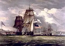 During the War of 1812, Nova Scotia's contribution to the British war effort involved communities either purchasing or building various privateer ships to attack U.S. vessels.[33] Perhaps the most dramatic moment in the war for Nova Scotia occurred when HMS Shannon escorted the captured American frigate USS Chesapeake into Halifax Harbour in 1813. Many of the U.S. prisoners were kept at Deadman's Island.
