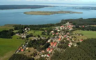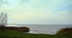 The Nowe Warpno Lake (German: Neuwarper See, Warper See;[1] Polish: Jezioro Nowowarpieńskie) is a bay on the southern shore of the Szczecin Lagoon. It runs for about 6 kilometres (3.7 mi) into the interior and has two narrow channels to the lagoon in the north that are each only 150 metres (490 ft) wide and divided by a small island of reeds.